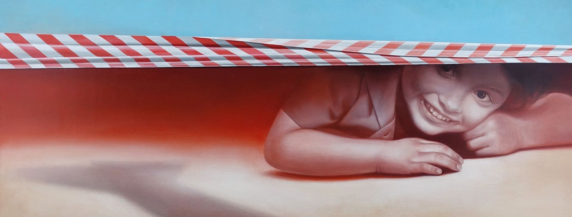 Eine altmeisterliche Lasurenmalerei macht die dargestellten Dinge so glaubhaft, dass der Betrachter auch die Aushebelung der Gesetze der Physik ganz „normal“ findet. Etwa wenn solide Sonnenschirme sich selbstständig machen und hinaus aufs Meer segeln. Diesmal freilich genügt der ominöse Schatten eines Flugzeugs, in Rapport gesetzt zu einem lachend ihm hinterherkrabbelnden Kind, um das ganze Möglichkeitsspektrum zu öffnen zwischen Napalm- und Rosinenbomber. (Karen Shahverdyan)
